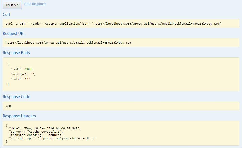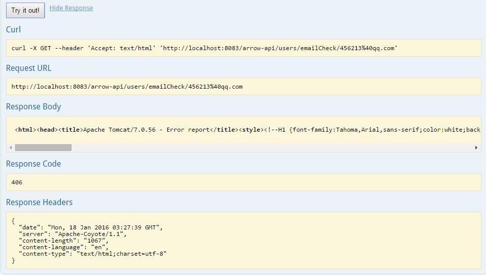 org.springframework.web.HttpMediaTypeNotAcceptableException: Could not find acceptable representation 细心的读者可能会发现,在本文第二张图中Curl中的header设置为'Accept: text/html',这和本文提出的问题有没有关联呢?下面我们再做一次实验,将email的值设置为456213,再次发送测试请求,界面返回结果如下图:
