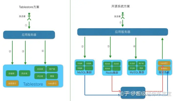 上面介绍了不同子功能的特点和系统要求,能满足需求的系统主要有两类,一类是阿里云的Tablestore单系统,一类是开源组件组成的组合系统。