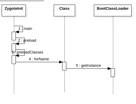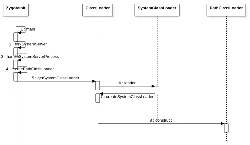看到这里我们终于知道了为什么PathClassLoader是Android应用默认的类加载器了并且只能加载已经安装到系统中的apk的class文件了。并且还知道了它的父类加载器是BootClassLoader。看源码发现在ZygoteInit函数中也调用了初始化了PathClassLoader,时序图如下所示: