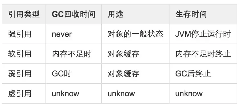 - 弱引用(WeakReference):如果一个对象只具有弱引用,那么在垃圾回收器线程扫描的过程中,一旦发现了只具有弱引用的对象,不管当前内存空间足够与否,都会回收它的内存。