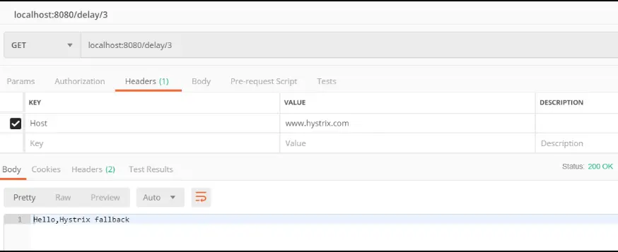 我们看方法中的第二个route,断言的判断为Host=.hystrix.com,当请求头中的Host为.hystrix.com,进入此路由,然后再过滤器中,设置Hystrix熔断,当请求超时时,请求转发到Gateway中的“/fallback”,/fallback我们将返回“Hello,Hystrix fallback”。我们启动Gateway,并通过Postman配置请求头Host=www.hystrix.com,访问http://localhost:8080/delay/3。结果如下: