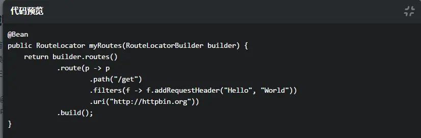 当我们访问http://localhost:8080/get时,Gateway首先会判断路径/get,确定路径/get符合条件后,在请求头中添加“Hello”—“World”。然后会转发请求到http://httpbin.org/get,然后返回上图的响应。