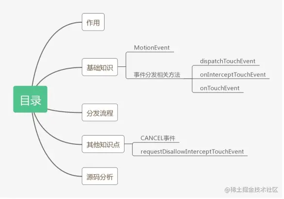 public boolean dispatchTouchEvent(MotionEvent ev)用于事件分发,将触摸事件向下传递给目标视图,如果它本身就是目标视图,则传递给自己来处理事件。返回结果受自己的 onTouchEvent 和下级 View 的 dispatchTouchEvent 方法影响。