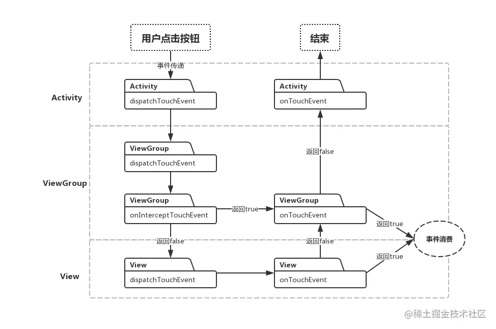 通过上面的伪代码,我们可以大致的了解事件的传递规则:对于一个根 ViewGroup 来说,点击事件产生后,首先会传递给它,这时它的 dispatchTouchEvent 就会被调用,如果它的 onInterceptTouchEvent 方法返回 true,就表示要拦截事件,接着事件就交给这个 ViewGroup 的 onTouchEvent 来处理,如果 onInterceptTouchEvent 返回 false,表示不拦截事件,当前事件就会传递给它的子元素,接着子元素的 dispatchTouchEvent 方法就会被调用,如此反复直到事件被最终处理。