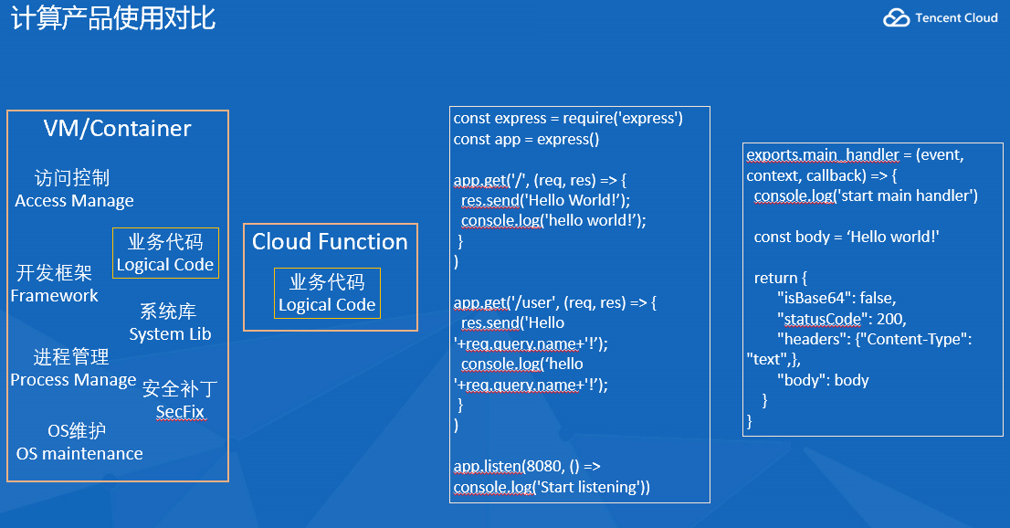 在目前云中提供的计算产品形态中,包含了虚拟机、容器与云函数。无论使用虚拟机还是容器,除了要关注自身业务代码之外,还需要有复杂的运维管理工作,例如管理启动进程、打安全补丁、选择开发框架、控制访问权限等等。而通过使用云函数,用户仅需按规范进行业务代码的编写,就可以对外提供服务。进程的启动时机以及运行所在的服务器运维可以完全交给平台。但当前的云函数产品,在开发方式上和已有的基于 vm 或容器的开发方式有所不同。在基于 vm 或容器的开发模式中,通过使用框架处理 http 请求,启动监听,并由外部命令或脚本来启动进程,是当前开发者都熟悉的业务编写模式。