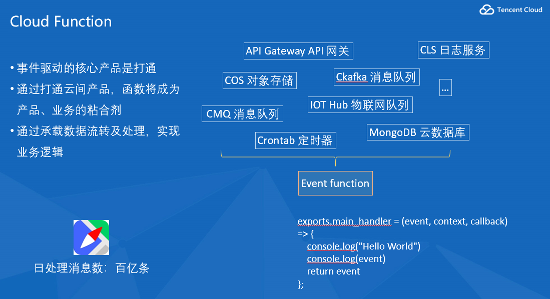 而使用云函数,http 请求会被转变为一个个的事件,业务代码可以直接针对事件进行处理,并按要求返回数据即可。这种由事件触发,接收 event 消息,并根据业务逻辑进行数据处理的云函数模型,是当前 serverless 的主要模式。这种模式的函数,我们称为 event function。