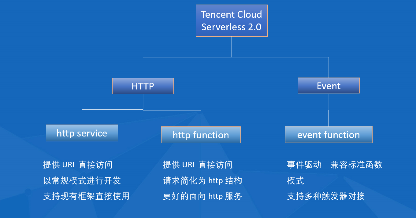 在 Serverless 2.0 中,我们将从客户的实际使用场景出发,进行了产品的梳理。针对事件驱动的函数,定义为 event function。事件函数仍然遵循现有的函数触发模式,并将持续增加与腾讯云其他各产品的对接,持续丰富应用场景,例如与日志服务对接,提供日志记录处理;与数据库对接,由数据修改动作触发函数运行;与云监控告警对接,针对告警事件可以进行自动化代码处理等。