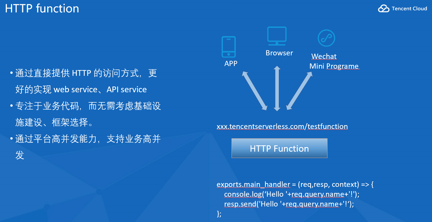 通过使用 http function,函数可以直接提供外部可访问到的 url 地址,无论是 app 应用,web 应用,还是微信小程序,都可以通过发起 http 调用,访问 url 来调用函数。而云函数开发中通常的 event 事件结构,优化为 http request、http response 结构,更符合 Web 服务开发的习惯。通过 request 结构,可以获取到 http 请求的相关信息,而通过 response 结构,可以自行构造出所需的 http 响应。