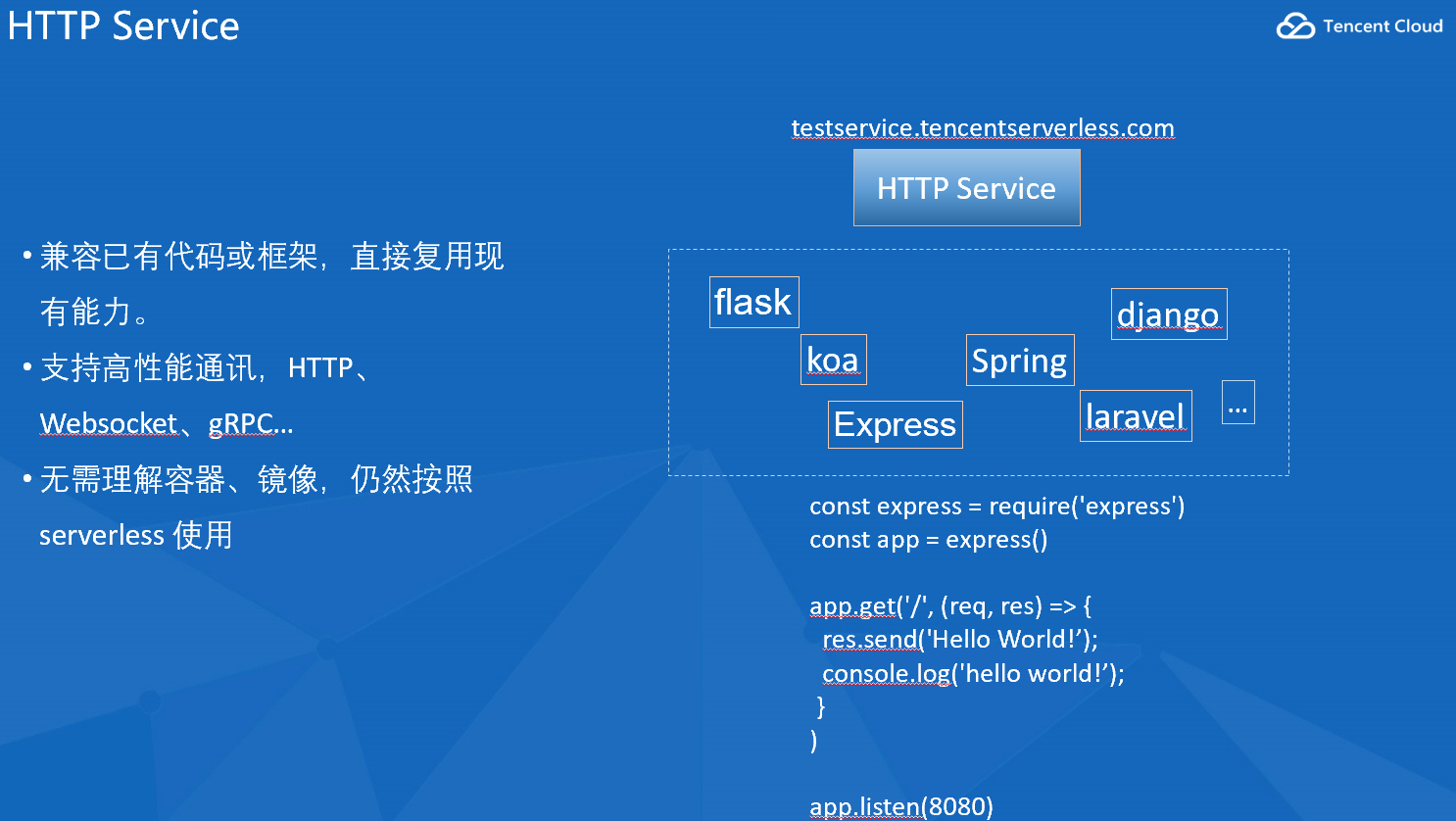 产品形态中提供的 http service,在同样对外提供 url 访问地址,支持应用直接访问的基础上,我们提供了针对已有代码或框架的支持。基于常用框架已经开发完成的业务代码,可以无缝迁移至 http service 中,直接开始以 serverless 模式对外提供服务。而服务中原有提供的高性能通讯协议如 websocket,gRPC,同样可以通过 http service 对外提供。