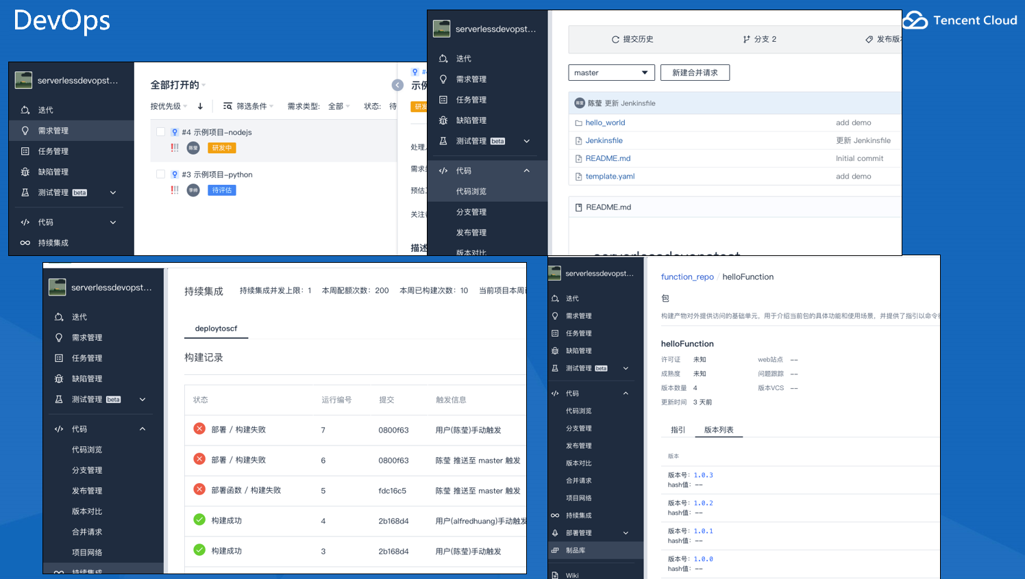 在 Serverless 的 DevOps 方面,通过与 coding.net 的合作,我们提供了 Serverless 的 DevOps 方案。通过打通 coding.net 的 DevOps 平台,从项目创建开始,我们就可以进入完全适配 Serverless 的全管理流程中。