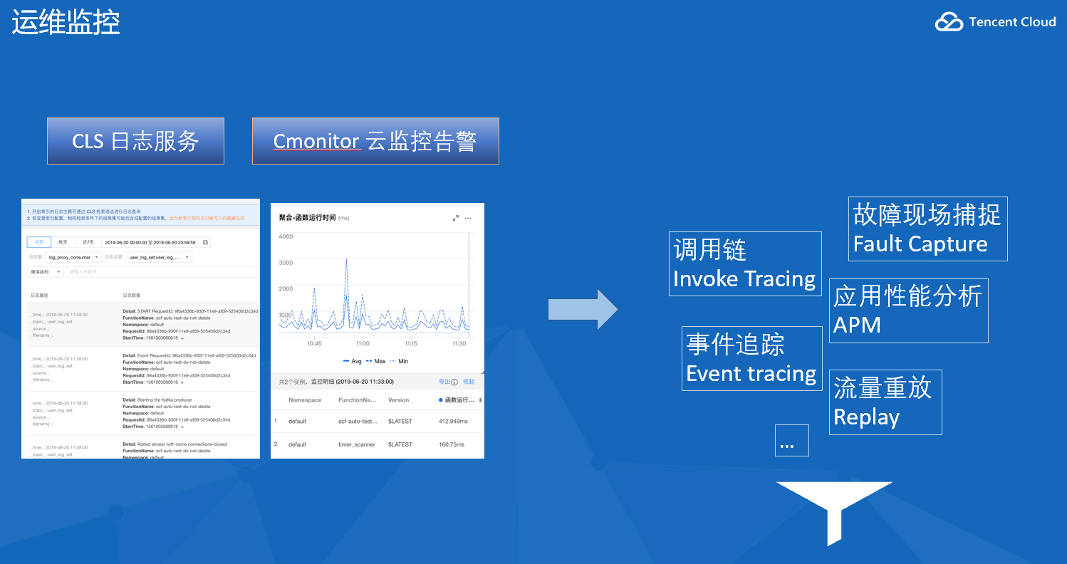 除了通过对接云的日志服务和监控服务,支持基于日志和监控的多种查询、过滤、告警之外,我们还在规划更多为用户提升调试能力的工具建设,例如通过调用链追踪,可以跟踪请求的经过的各个产品、服务或函数;通过故障现场捕捉,可以抓取函数运行失败时的现场及事件,便于进一步分析代码故障;而应用性能分析,可以了解到函数内部的代码或模块性能,便于进一步提升应用性能。