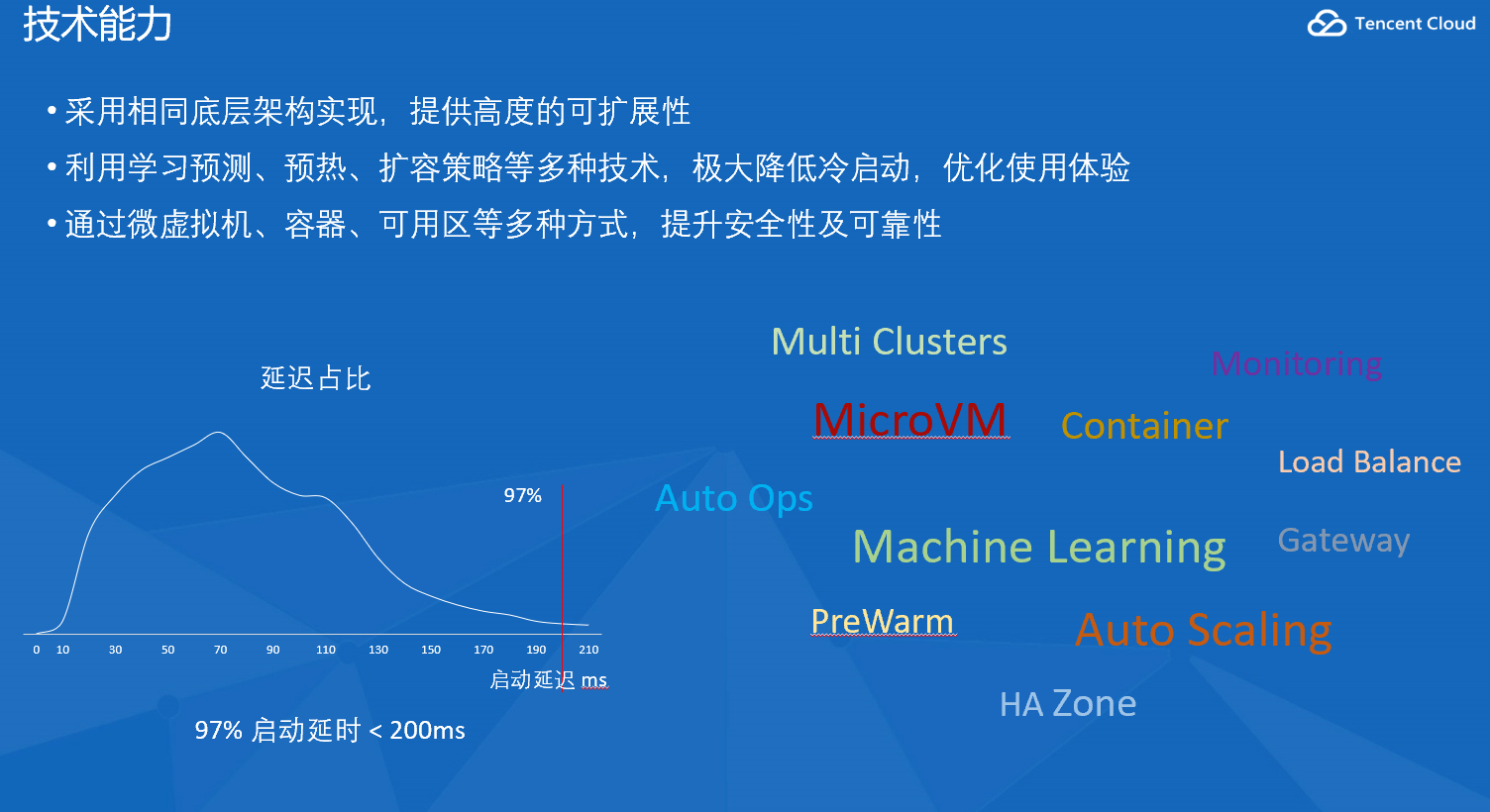 在 Serverless 平台通常碰到的延迟性能方面,通过应用机器学习,预热,扩展策略等多种技术,极大的降低了冷启动。通过当前平台分析,目前 97%的事件型函数启动延迟均低于 200ms,对业务基本做到了极低感知,满足了各种场景的应用。多可用区、多集群、自动运维、平台监控技术的应用,进一步的在提升整体产品的可靠性及安全性。
