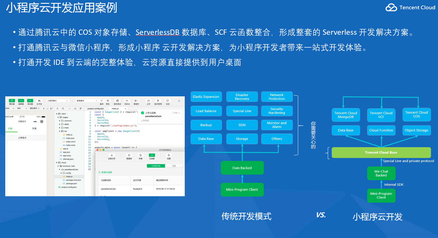 与 2018 年 9 月,由腾讯云和微信联合推出的小程序云开发解决方案,将 Serverless 概率推向了广大的国内小程序开发者,获得了大量的客户及使用。小程序云开发解决方案,通过整合腾讯云的对象存储,云数据库,云函数,形成了一套可以直接提供给最终开发者的解决方案,带来了一站式的开发体验。
