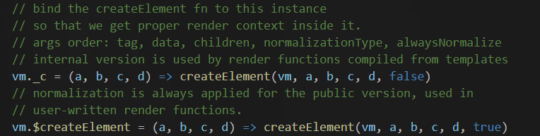 从代码中查询vm.$createElement的定义,发现还有一个 _c方法,实际上, _c 方法,它是被模板编译成的 render 函数使用,而 vm.$createElement 是用户手写 render 方法使用的, 这俩个方法支持的参数相同,并且内部都调用了 createElement 方法。
