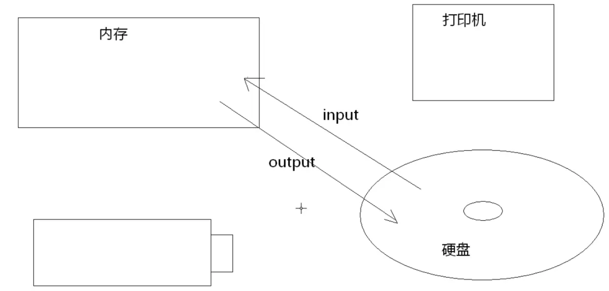 IO:用于处理设备上数据的一种技术,处理设备上数据包括(Input / Output) ,设备指的是:内存,硬盘,U盘,打印机,等等..........