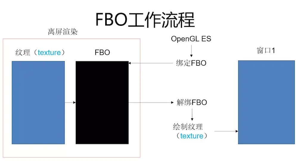 FBO(Frame Buffer Object)即帧缓冲区对象,实际上是一个可添加缓冲区的容器,可以为其添加纹理或渲染缓冲区对象(RBO)。