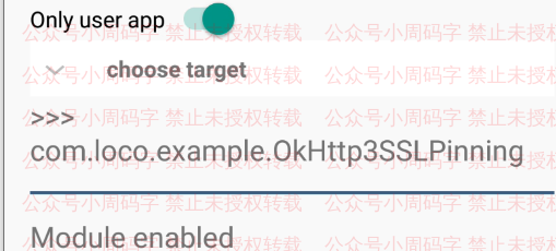 准备好了环境之后,我们就可以开始破解这个Demo APP了,打开Inspeckage,点击“choose target”选中想要Hook的APP(这里选择“APP加密参数DEMO-初级篇”)。