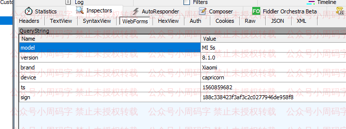 看到了吗?直接就得到了它的原文:brand=Xiaomi&device=capricorn&model=MI 5s&ts=1560859682&version=8.1.0了,轻轻松松地就破解了这个APP的sign参数,全程只用了一分钟!
