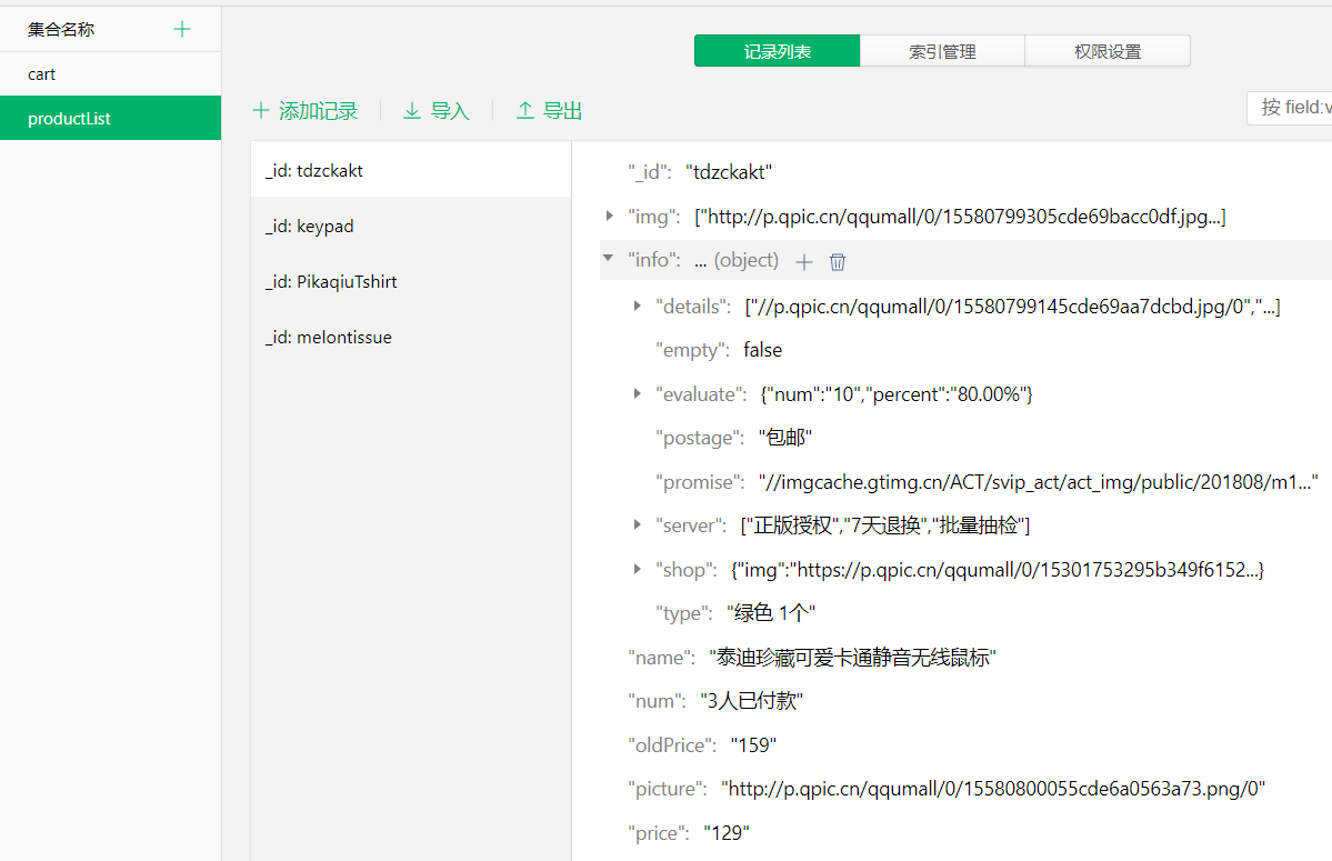 - 点击商品进入页面时,获取商品的id,并在点击加入购物车时调用addProduct云函数,传入商品的id。