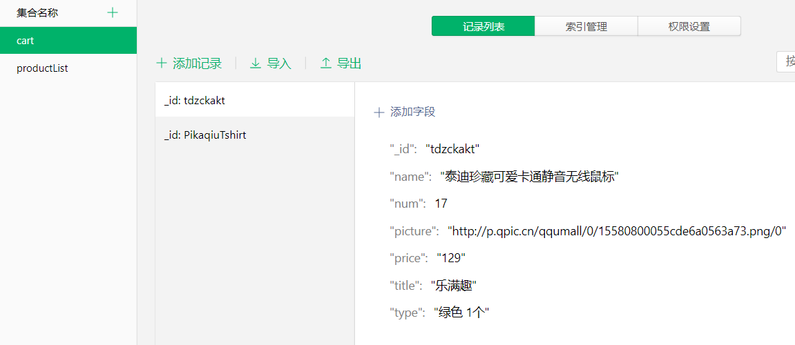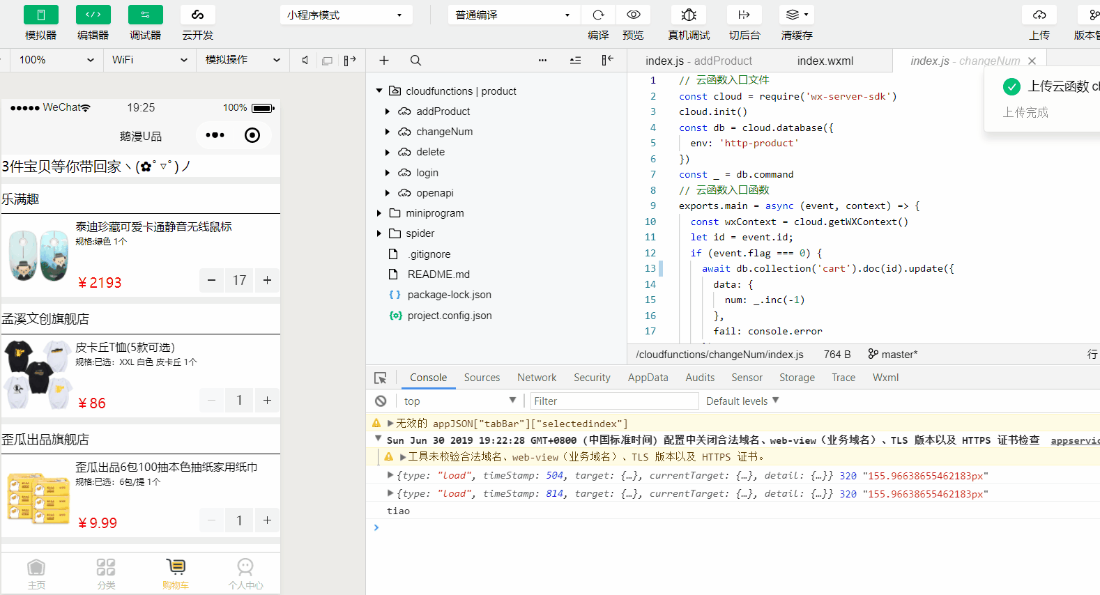 3个云函数addProduct,changeNum,delete。分别对应添加商品,更改商品数量,删除商品。