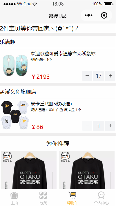 minus,plus方法调用同一个云函数changeNUm,只是传入不同的flag值,云函数通过flag值判断执行 + 或 - 操作,并修改数据库的值,自动计算此商品的总价。