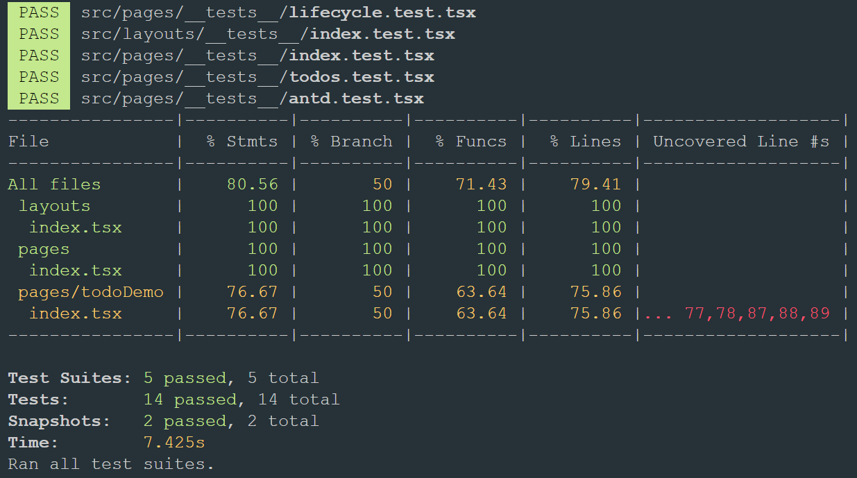 最后,我们运行一下umi test --coverage, 就可以看到最后的覆盖率数据了。其中未测试的代码为mapDispatchToProps和mapStateToProps