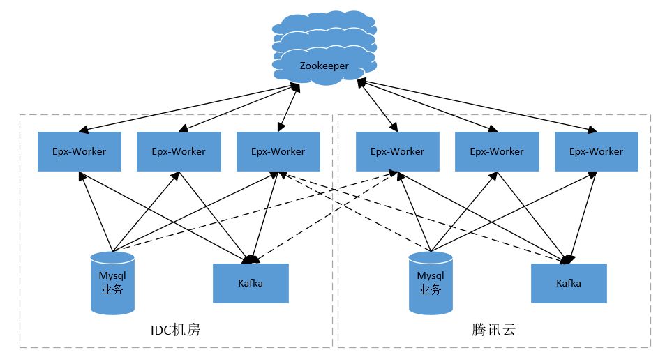 为了保证EPX项目稳定性达到5个9及异常情况快速降级处理,我们增加了多Worker集群模式,并且实现了EPX项目多机房部署。