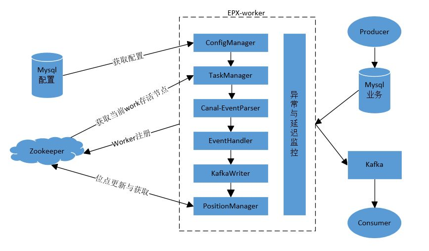 EPX主要对MySQL数据库进行实时监听,是一个从Mysql实时同步变更到Kafka的高可用、高性能、可追溯的数据管道。EPX通过Binlog Dump实时获取数据库的增量日志,并通过解析后获取具体的数据变更,最后将变更记录推送到Kafka中以供业务方消费。
