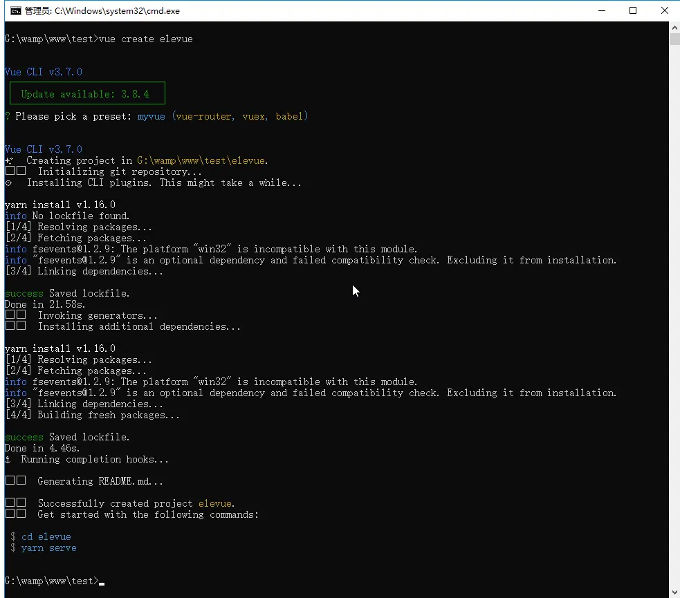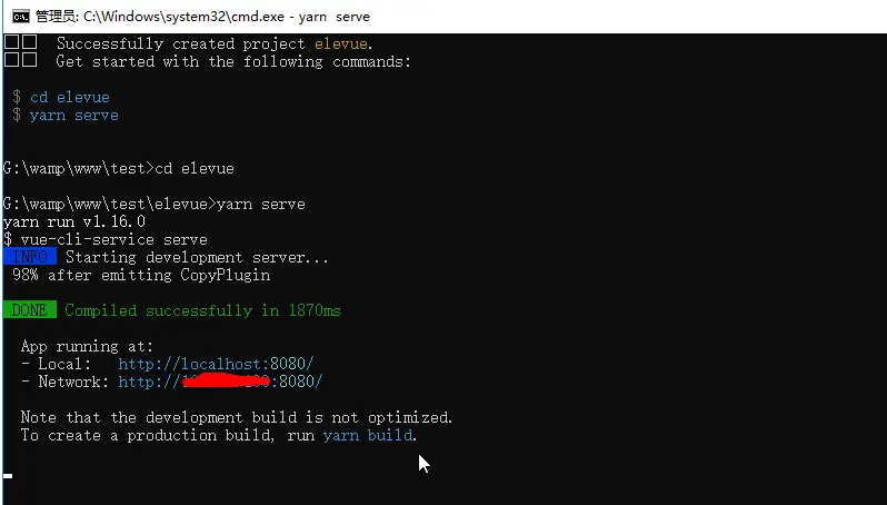 - 切换目录到刚刚创建的项目根目录下运行 yarn serve命令开启服务