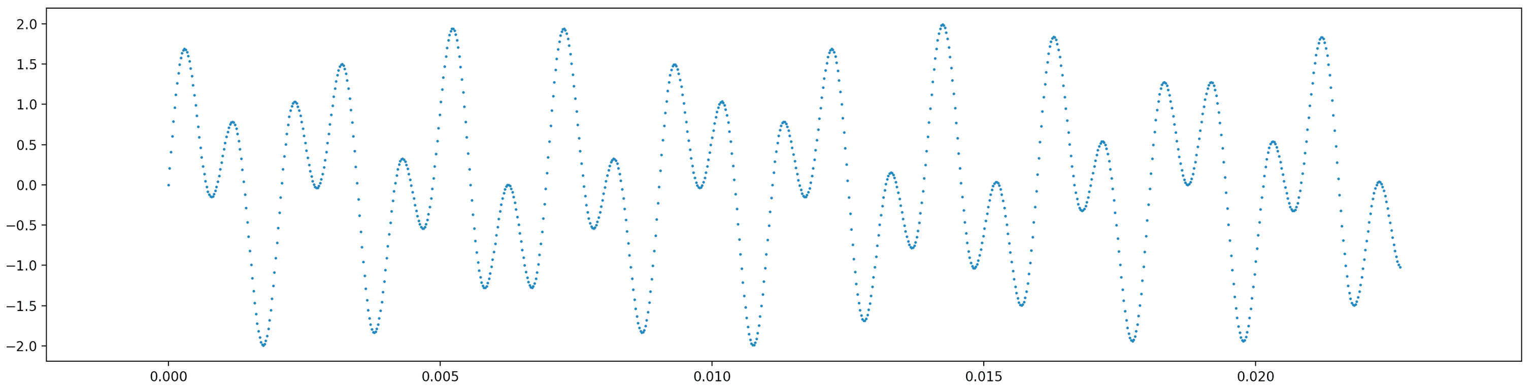 plt.scatter(t[0:1000],(y+y2)[0:1000],s=1)