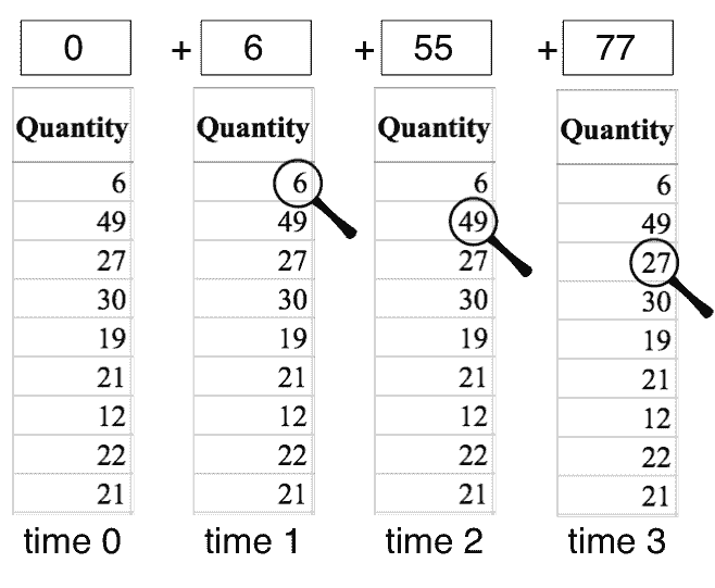 让我们从一个非常简单但非常常见的模式开始,称为累积。该模式遍历一系列元素并累积一个值。例如,为了对序列中的数字求和,我们使用带有+运算符的累加器运算。当我们遍历序列时,我们更新一个初始化为 0 的流动总和:
