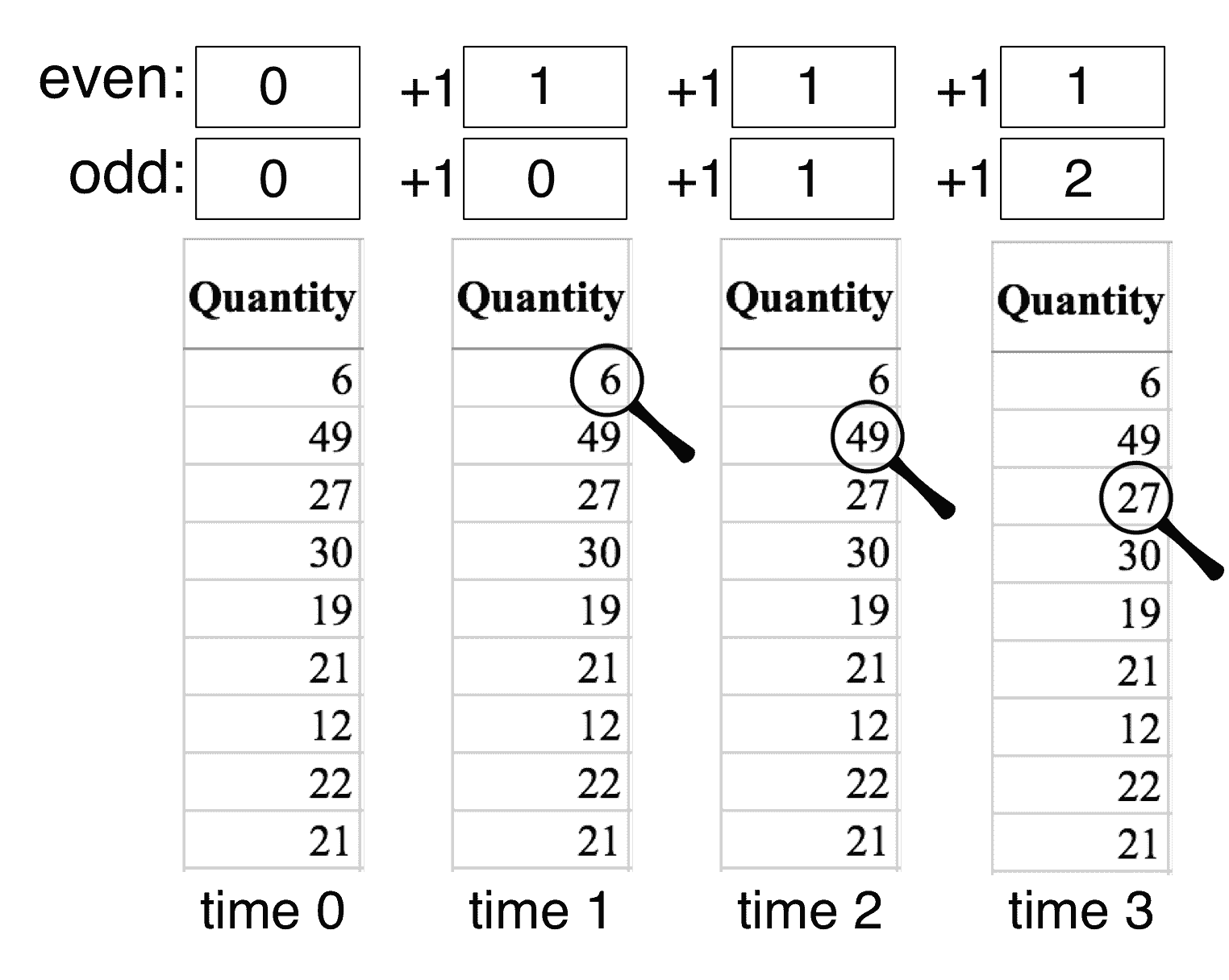 我们可以更新多个流动的累计值,而不只是一个。例如,假设我们想要计算序列中偶数和奇数值的数量。我们需要两个累加器,从零开始,但操作是相同的: