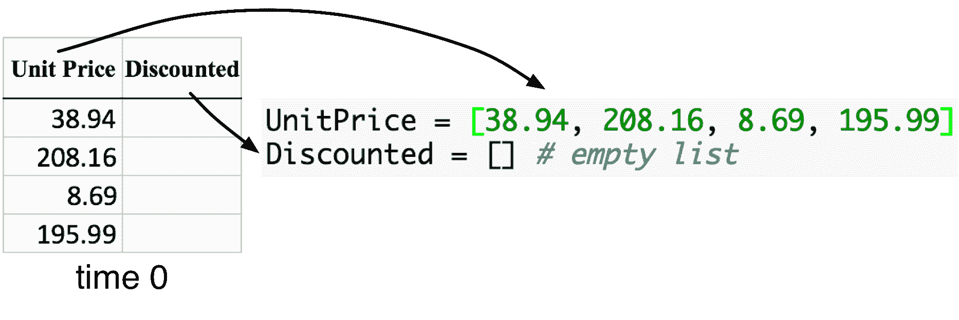 Discounted = [price * 0.95 for price in UnitPrice] # a list comprehension