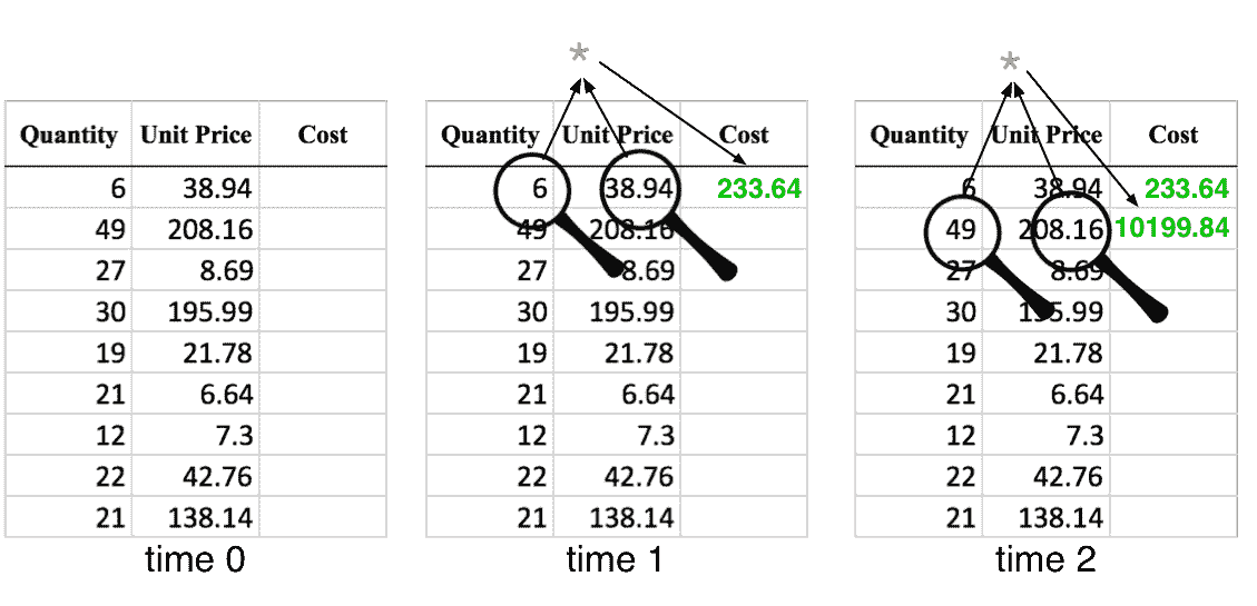 让我们看一下代码模式,一次遍历两个列表,将结果放在第三个列表中。例如,要计算销售交易的成本,我们将数量乘以单位价格。在电子表格中,如下所示: