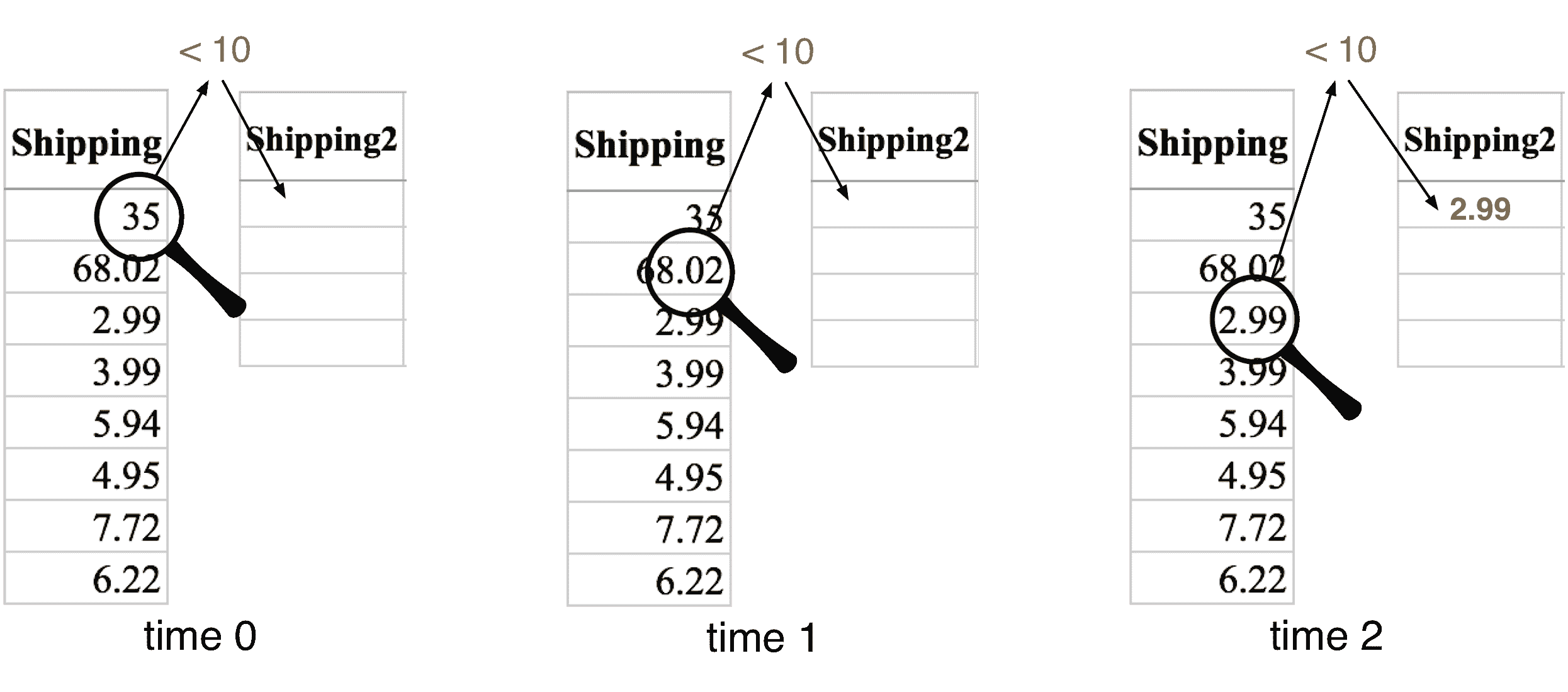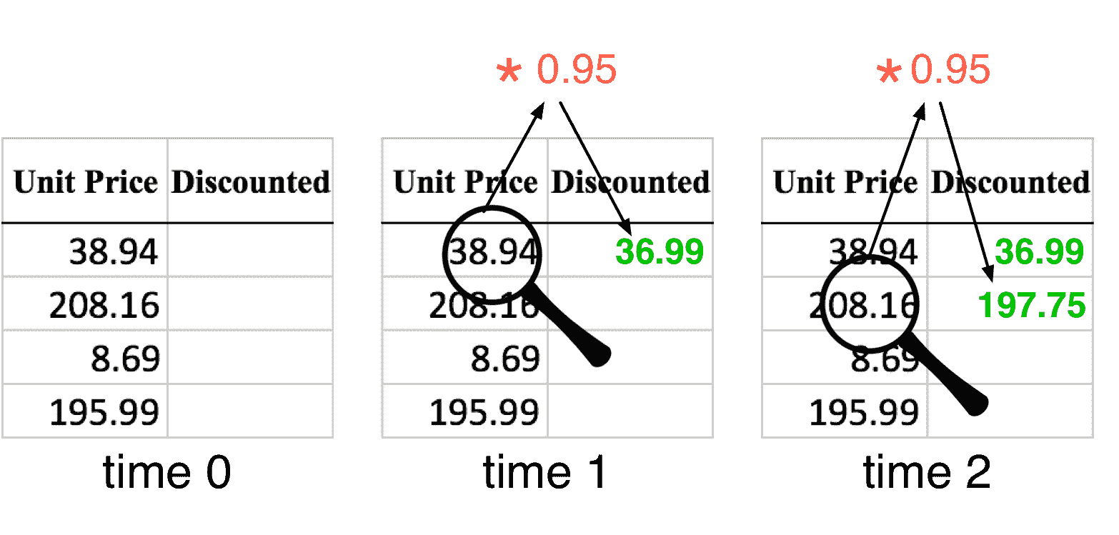 也许最常见的操作是,将一个序列映射到另一个序列,将运算符或函数应用于每个元素。(它就像一个累加器,它累积了一个项目列表,而不是一个单独的值。)例如,使用电子表格创建一个新列,包含 5% 折扣的单价,在电子表格中如下所示: