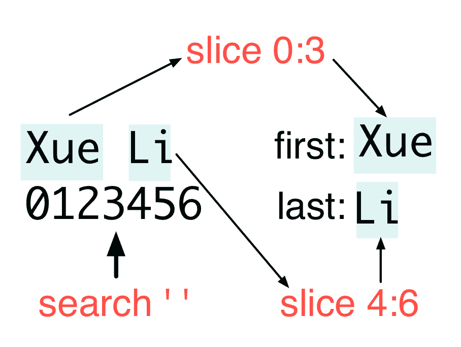 搜索操作甚至可以在字符串(字符列表)中使用,来找到感兴趣字符的位置。 例如,要将全名切割为名字和姓氏,我们可以将搜索空格字符与两个切片操作组合在一起。 给定全名Xue Li,搜索空格字符将返回第四个位置或索引 3。要提取第一个名称,我们将从索引 0 切片到索引 3,仅排除右侧。 为了获得姓氏,我们从索引 4 切换到 6,仅排除右侧。
