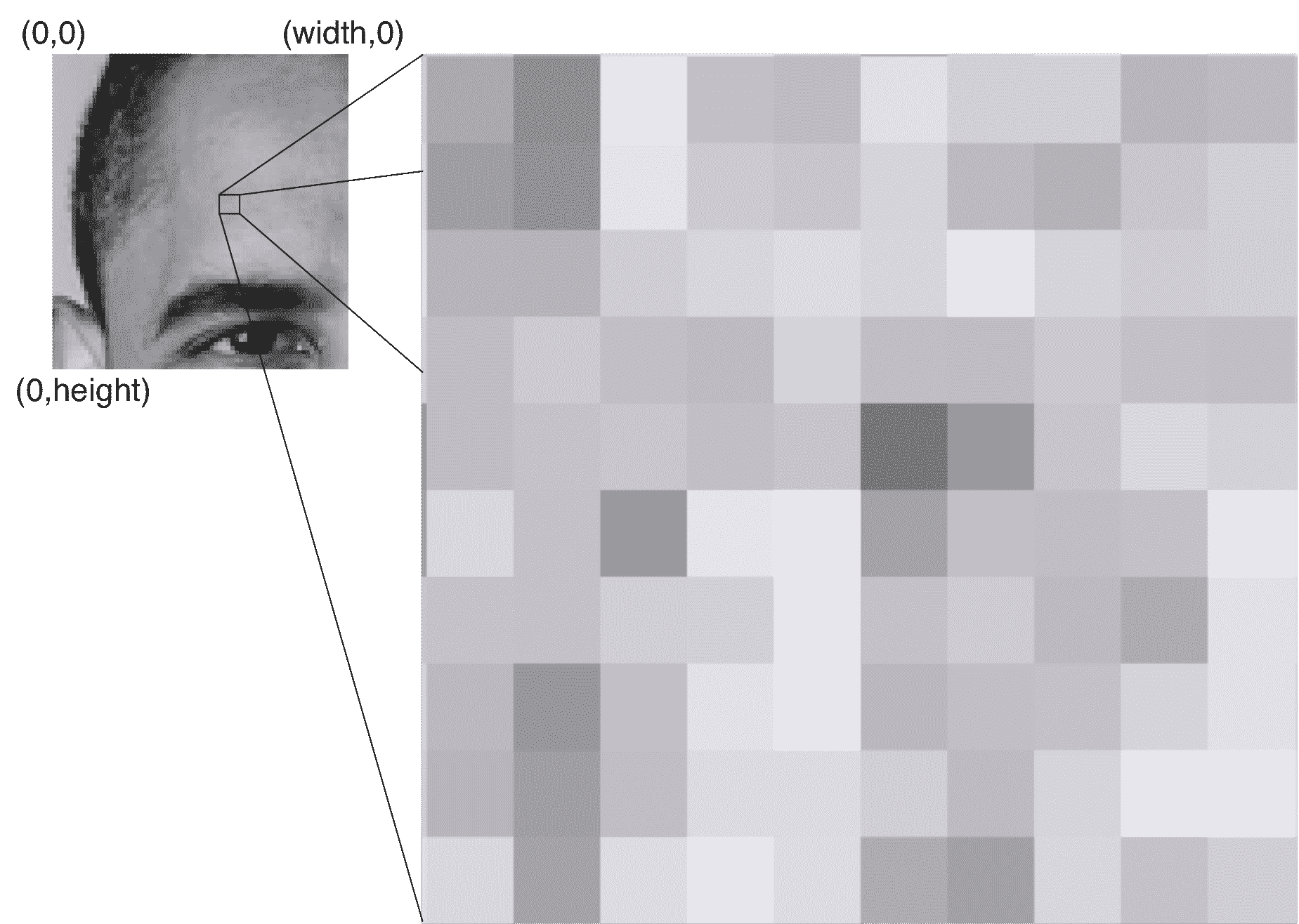 在这个课程的图像项目中,我们为图像做了很多有趣的事情。 图像只不过是二维矩阵,其条目是从 0 到 255 的像素灰度值。像素值 0 是黑色而 255 是白色。 例如,如果我们放大图像,我们会看到二维矩阵的各个元素(称为像素):