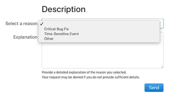 2、填表就行了,关键是最后一部分,你有三种选择来申请加急审核。分别是:致命 bug、敏感时间问题、以及其他特殊情况。