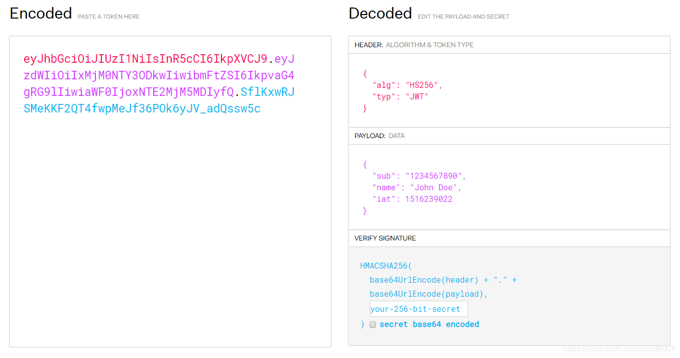 上图中,左半部分是生成的token,右半部分是加密前的明文。分为三部分:header,payload,verify signature。
