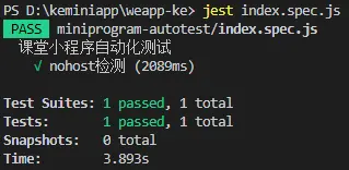 运行jest index.spec.js, 如果页面中不存在nohost组件则测试通过,结果如图所示:
