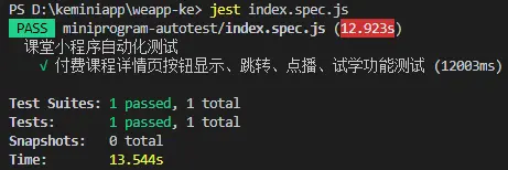 最后,jest默认一个测试项的时长不能大于5秒,这项测试既有页面跳转又有视频播放,明显会超出5秒的限制,实际耗时约为15秒左右,所以修改时长限制为20000毫秒。