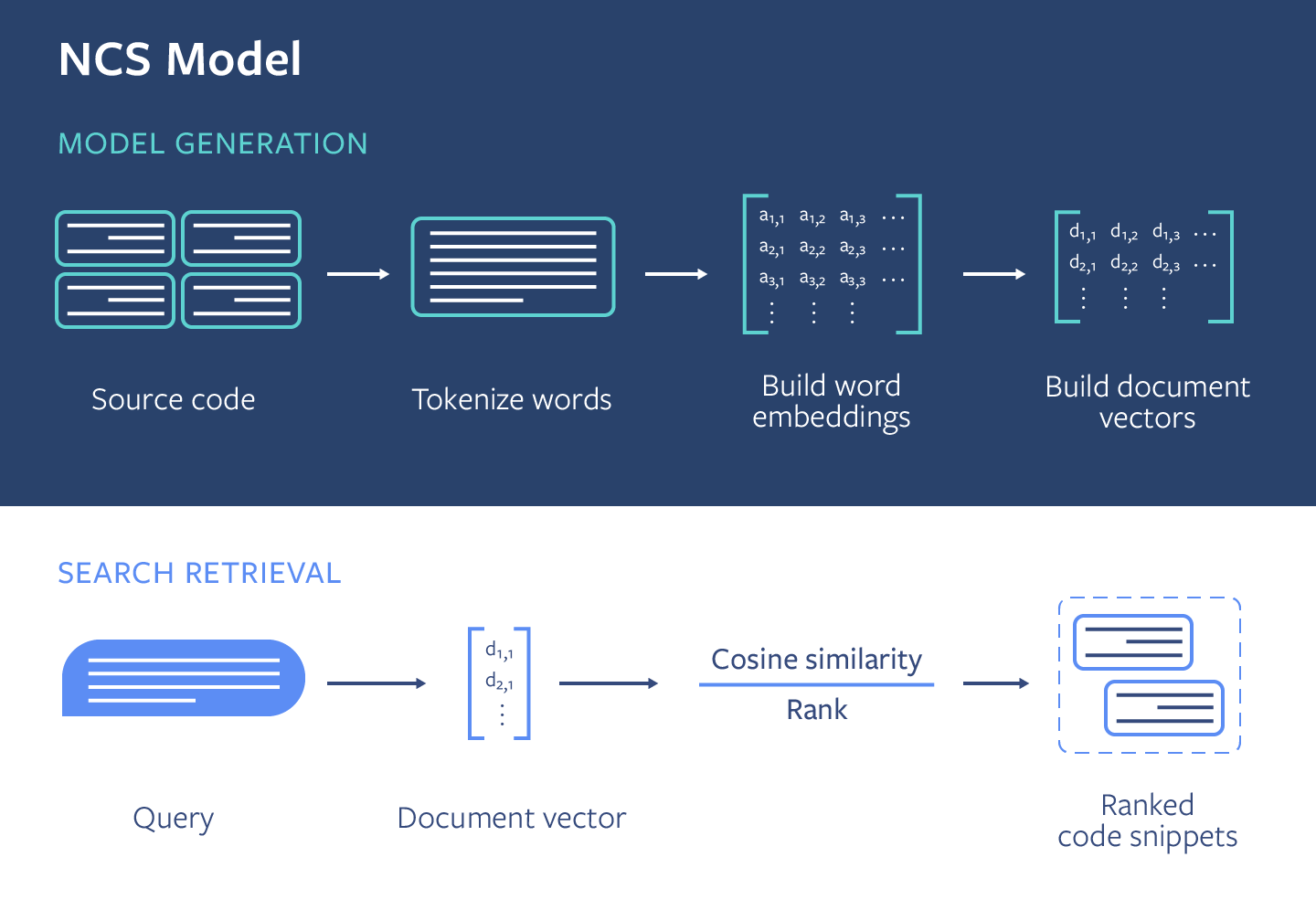 We use this concept to build the NCS model. At a high level, each code fragment during model generation is embedded in a vector space at a method-level granularity. Once the model is built, a given query is mapped to the same vector space, and vector distance is used to estimate the relevance of code fragments to the query. This section will describe the model generation and search retrieval pipeline, as shown in the diagram below, in more detail.