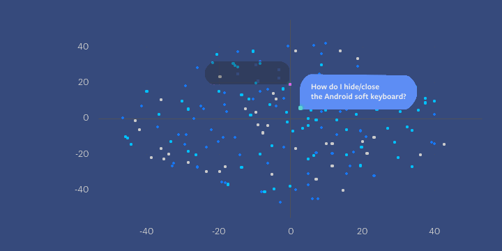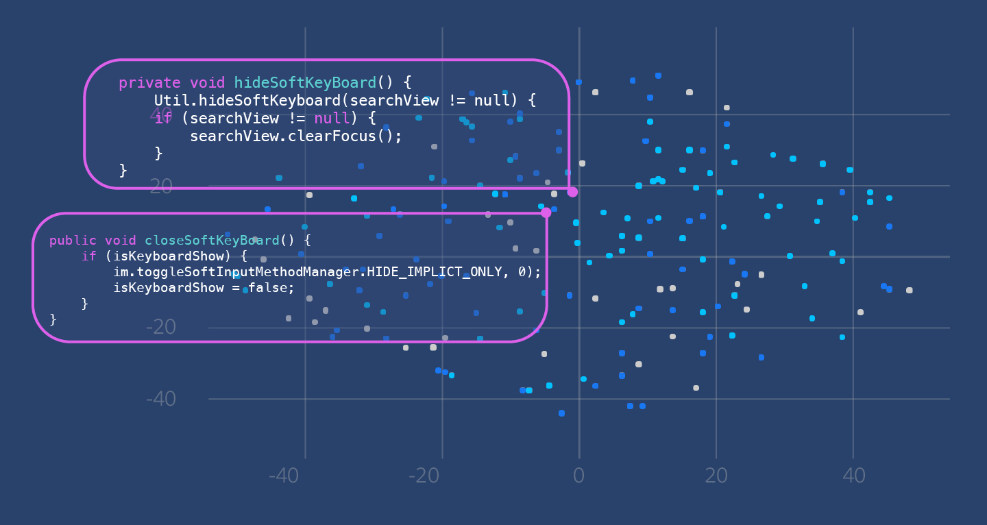 The NCS model captures program semantics (in this case, the intent of the code snippet) by using embeddings — continuous vector representations that, when computed appropriately, have the desirable property of putting semantically similar entities close to each other in the vector space. In the example below, there are two distinct method bodies that both pertain to closing or hiding the Android soft keyboard (the first question above). Since they share similar semantic meanings, even if they do not share the exact same lines of code, they are represented by points in the vector space that are close to each other.