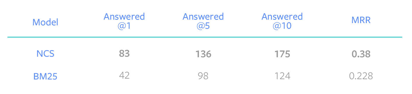 We evaluated NCS’s performance using Stack Overflow questions, with the title as the query and a code snippet from the answers as the desired code answer. Given a query, we measure whether our model was able to retrieve from a collection of GitHub repositories a correct answer in the top 1, 5, and 10 results (labeled Answered@1, 5, 10 in the table below, respectively). We also report mean reciprocal rank (MRR) to measure at which nth result NCS was able to answer the question correctly. We explain the experimental setup in more detail below. Out of the 287 questions in the Stack Overflow evaluation data set we created, NCS answered 175 questions correctly in the top 10 results; this equates to over 60% of the entire data set. We also compared NCS’s performance with that of a traditional IR technique, BM25. As shown in this table, NCS outperformed BM25.