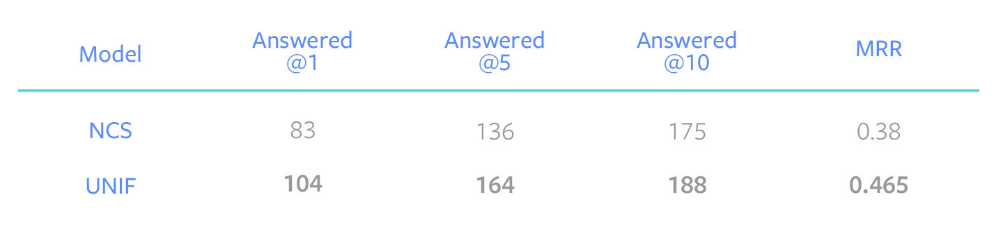 We compared NCS and UNIF against the Stack Overflow evaluation data set, to see whether the model correctly answered the query in the top 1, 5, 10 results, along with the MRR score. The table below shows that UNIF improves the number of questions answered significantly over NCS.