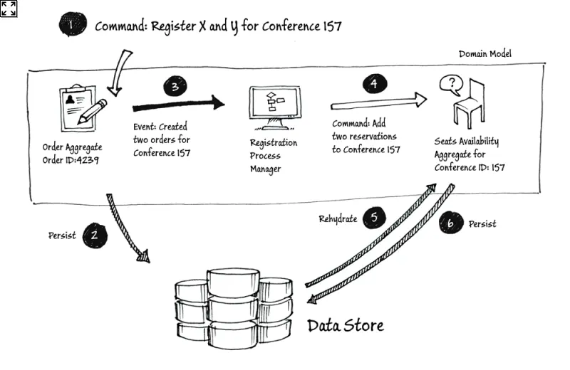 RegistrationProcessManager类将发送一个命令到ID为157的可用座位(SeatsAvailability)聚合