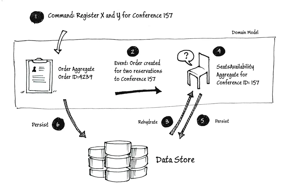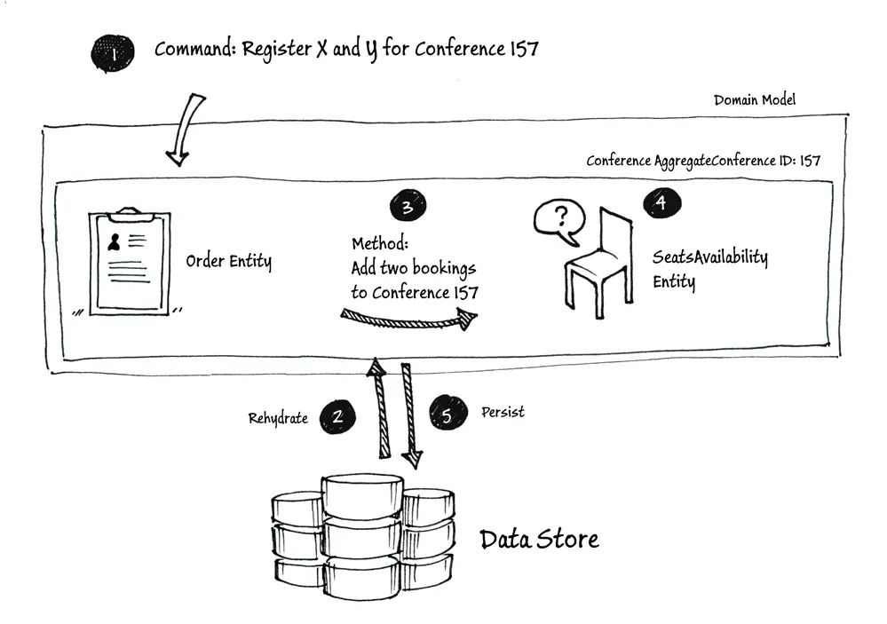 - 订单(Order)实体将校验本次预订(它将查询可用座位(SeatsAvailability)实体以查看是否还有足够的座位),然后调用方法更新在会议(Conference)实体上预订的座位数量。
