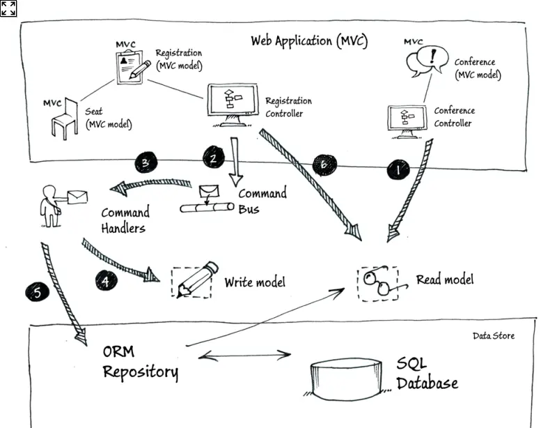 开发人员1:这难道不是让事情变得比需要的更复杂了吗?使用CQRS的动机之一就是简化事情!现在我们有了领域对象,它们需要使用ORM层来持久化它们的状态。然后我们又要引发事件来报告它们所持久化的内容,因为这样我们就可以运行单元测试了。
