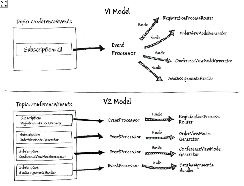 在V1中,在某些场景里,如果在处理事件时发生错误,系统可能多次处理事件。为了避免这种情况,团队修改了体系结构,以便每个事件处理程序都有自己对Azure Topic的订阅。下图显示了两个不同的模型。