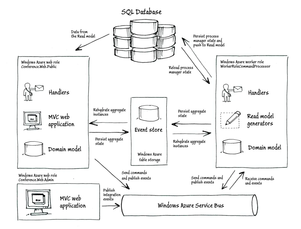 该应用程序旨在部署到Microsoft Azure。在旅程的这个阶段,应用程序由两个角色组成,一个包含ASP.Net MVC Web应用程序的web角色和一个包含消息处理程序和领域对象的工作角色。应用程序在写端和读端都使用Azure SQL DataBase实例进行数据存储。在某些地方,应用程序还在写端使用Azure table,在读端使用Azure blob来存储数据。应用程序使用Azure服务总线来提供其消息传递基础设施。下图展示了这个高级体系结构。